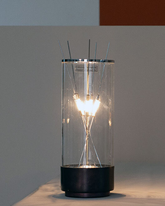 A recognized icon of experimental design, this lamp entered the permanent collection of the MoMA in New York as early as 1970 and has been exhibited in the Louvre and the Centre de Création Industrielle.