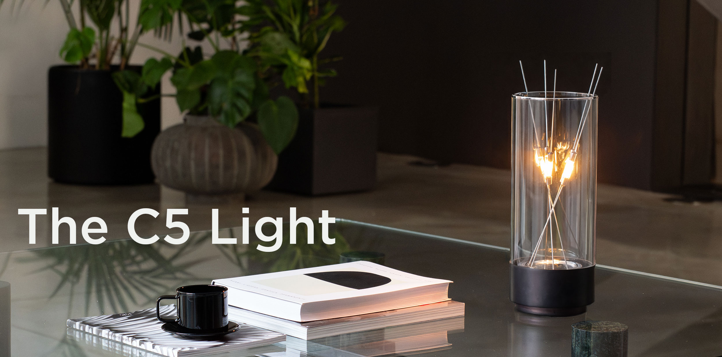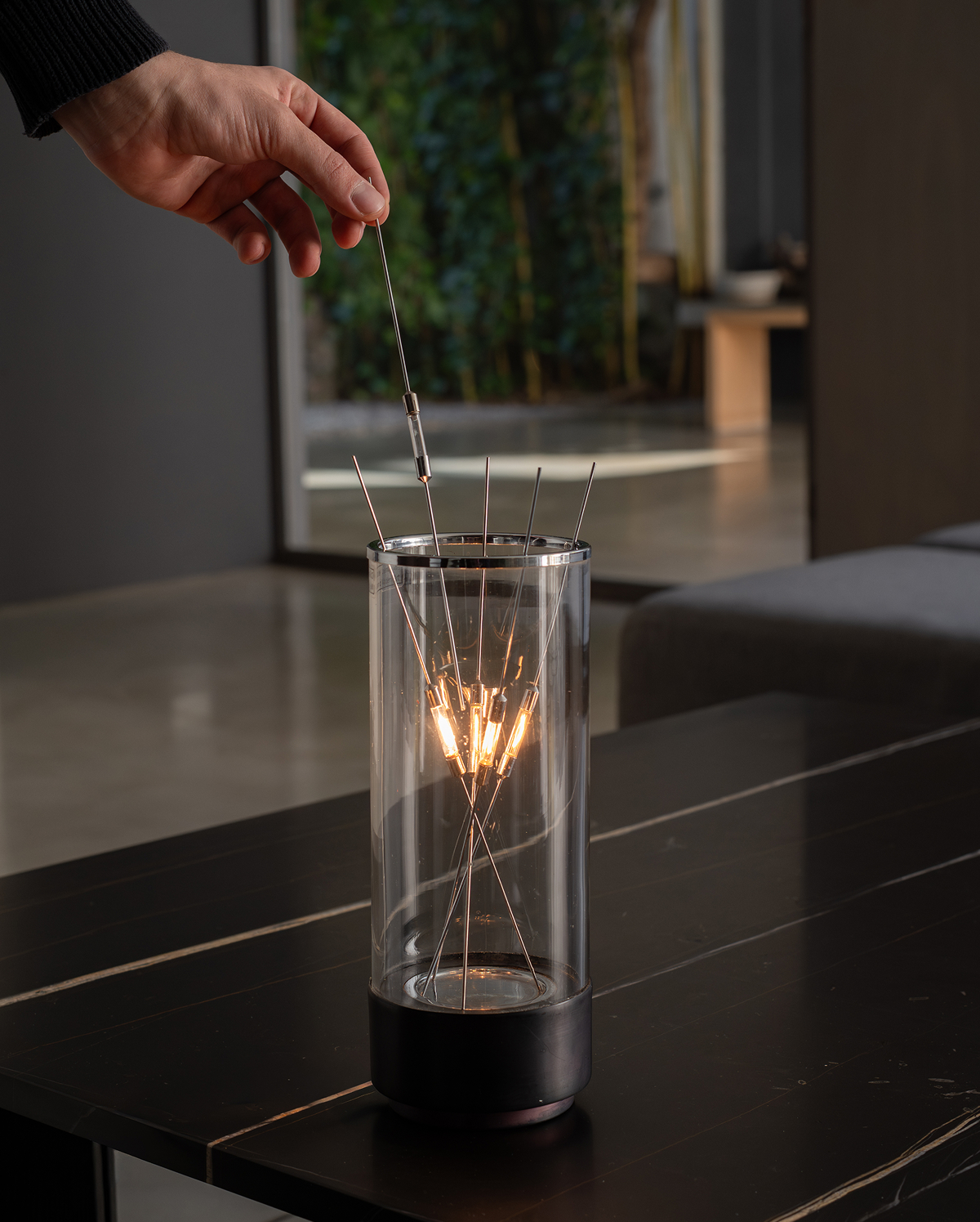 The C5 is a precise balance between beauty, technology, and function. While the amount of light is controlled by the user, the construction is rigorous: the base contains a transformer that keeps the interaction safe. The bottom plate features a subtle groove to hold the stick ends, while the cylinder of glass allows the sticks to rest without shorting the circuit.
